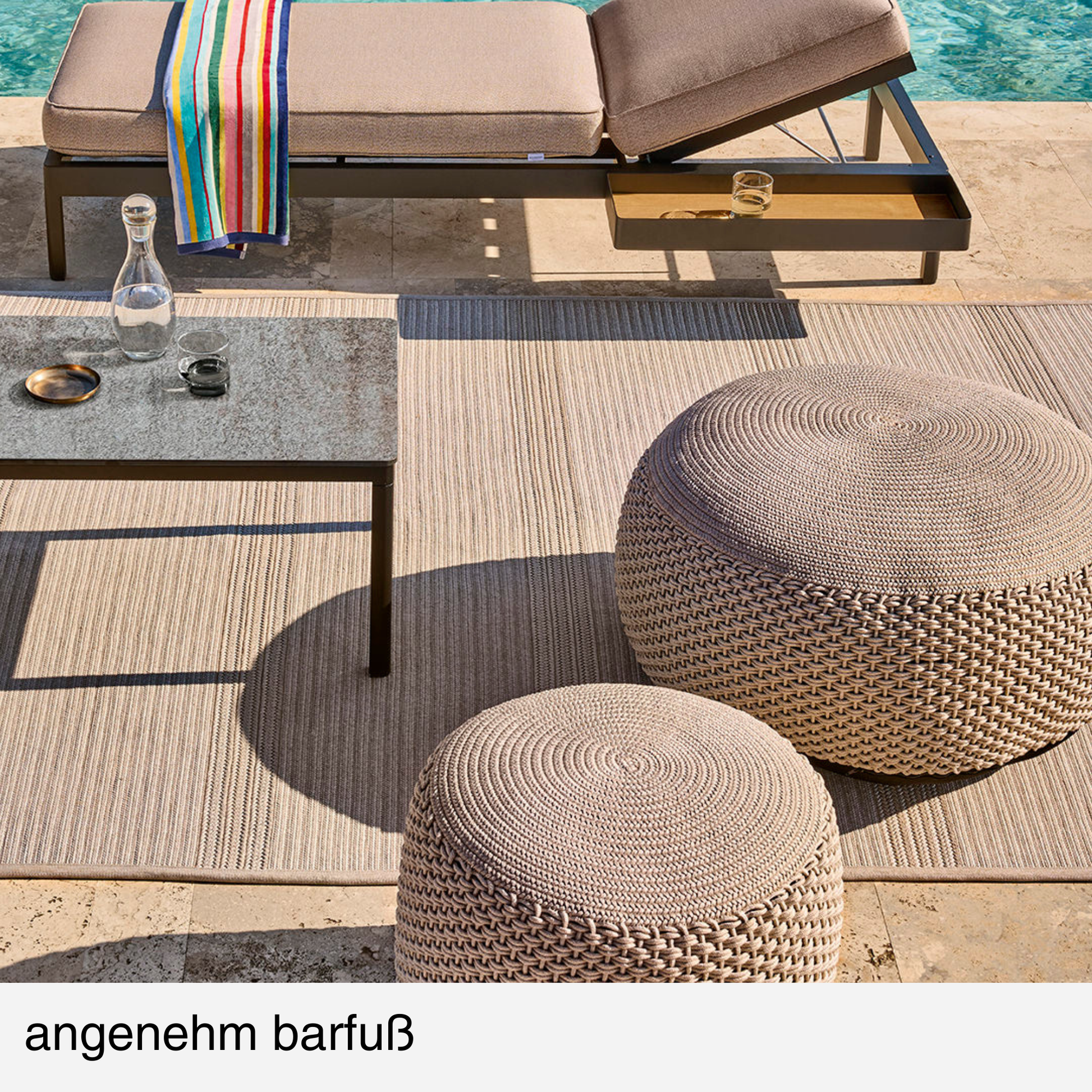 Der Teppich lässt sich ideal mit Weishäupl Loungemöbeln, Körben und Poufs kombinieren – für ein ruhiges, durchdachtes Outdoor- und Indoor Wohngefühl