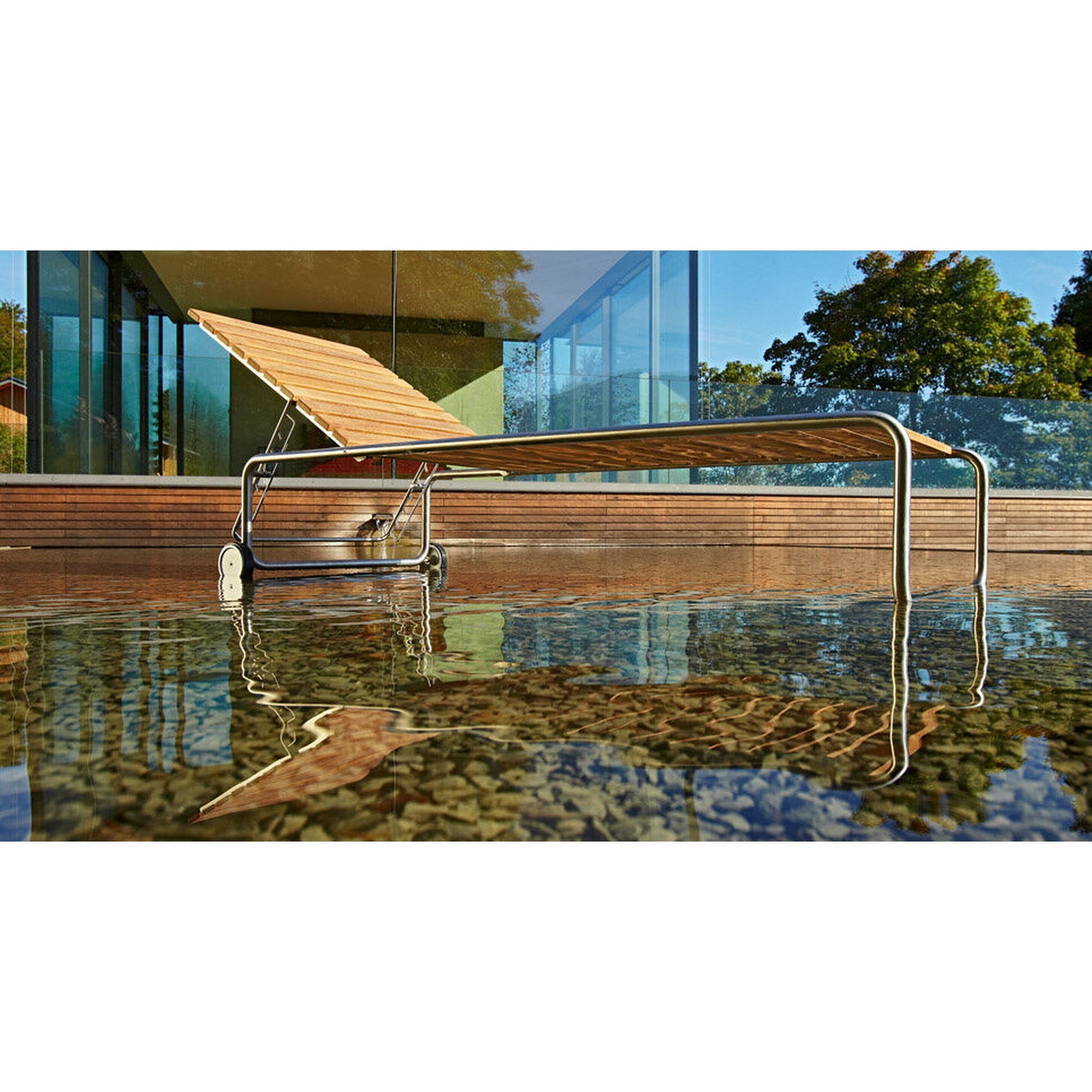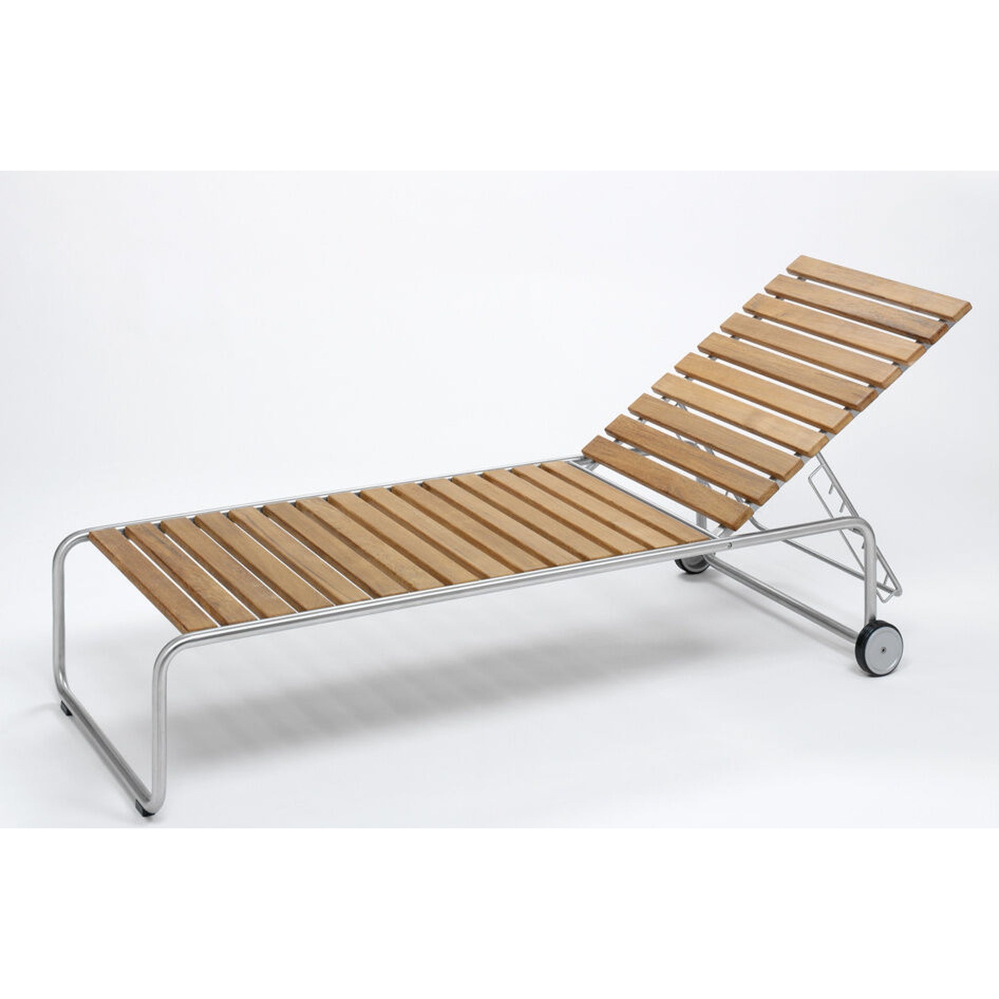 Das Gestell ist wahlweise in Edelstahl AISI 304 oder pulverbeschichtet erhältlich. Die Liegefläche ist mit einer hochwertigen Belattung aus massivem Teak ausgestattet. Damit fügt sich die Liege harmonisch in jedes Ambiente ein – modern, langlebig und pflegeleicht.