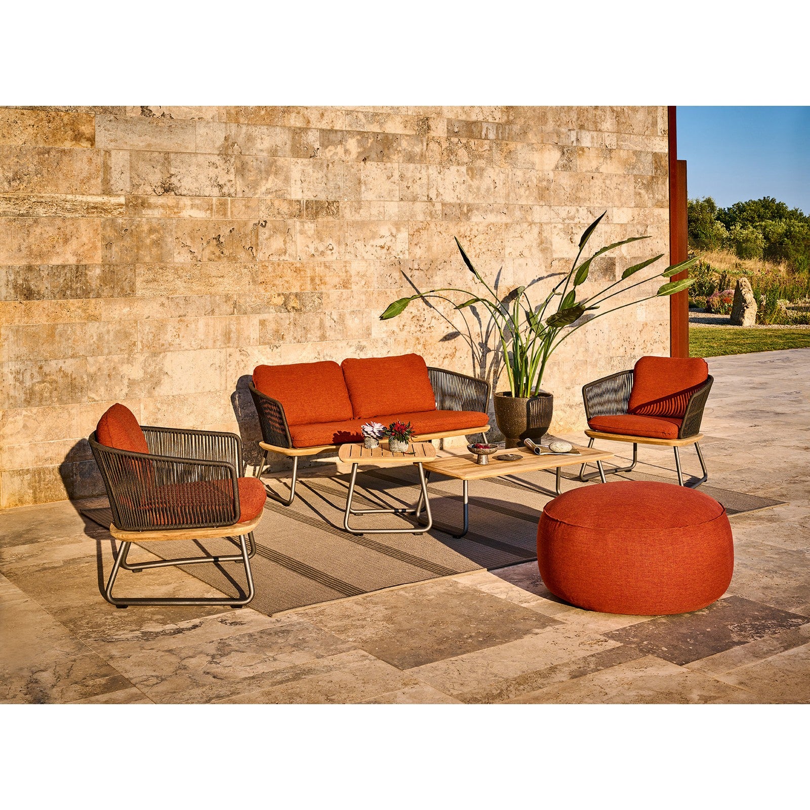 Runder Outdoor-Hocker – flexibel nutzbar als Sitzgelegenheit, Fußablage oder dekoratives Element. Harmoniert perfekt mit allen MALIHA-Outdoor-Möbeln. Wetterfest, pflegeleicht und bequem gepolstert.